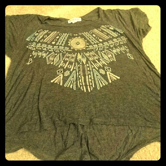 Gray flow shirt with tribal pattern on the front, open back, goes great with high waisted shorts!