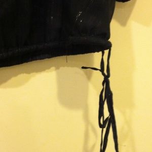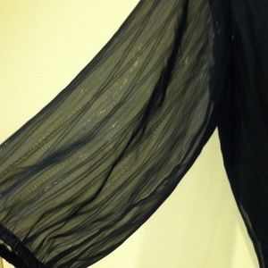 navy and metallic stripes bubble sleeves and bubble waist ! Very nice for that night out ! Dark color so gives a slim look gently used!
