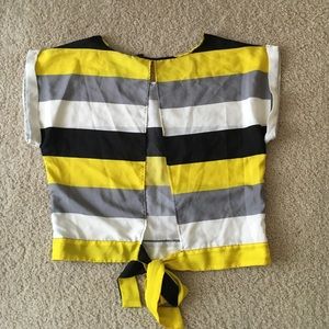 Fun sleeveless shirt/blouse. Open back with tie at hem. Hits at hip. 100% polyester. Never worn.