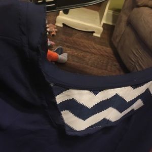 Blue blouse wig white and blue chevron down the front with fringed sleeves and neckline. Opens at bottom in back