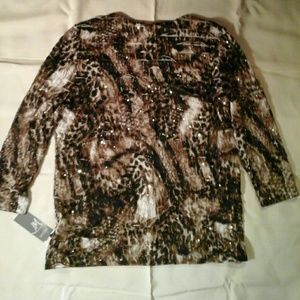 Long sleeve ruffled animal print blouse with small gold mirror sequins