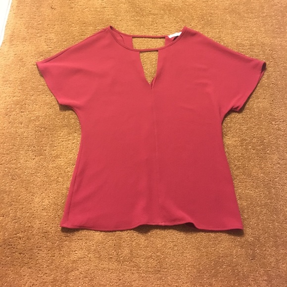Super cute pretty red colored shirt! It opens in the front just a little bit not to much! Gives a nice slimming appearance!
