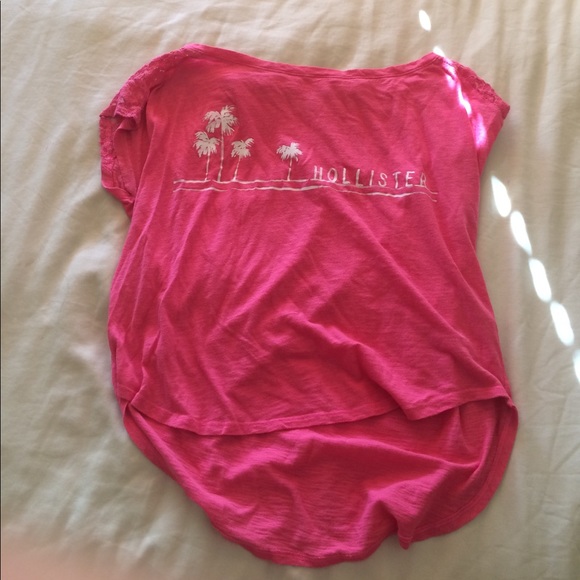 Bright pink short sleeve shirt with lace on the shoulders. Back is longer so it covers butt. Good condition.