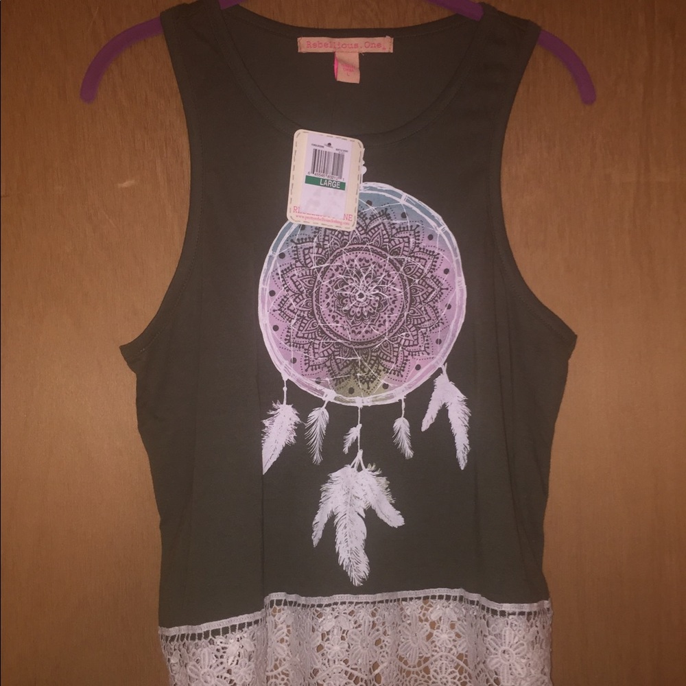 Sleeveless Navy green shirt with a dream catcher design on the front with lace detailing all around the bottom