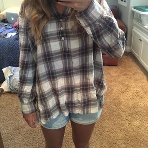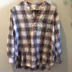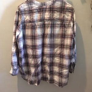 Plaid flannel, purple, tan, white, long sleeve, not a full button down