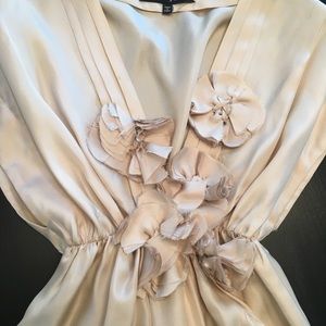 Silk Robert Rodriguez blouse with flower detail. Some small damages. Not so obvious when the blouse is Warren because of its pleaded style. See top pics