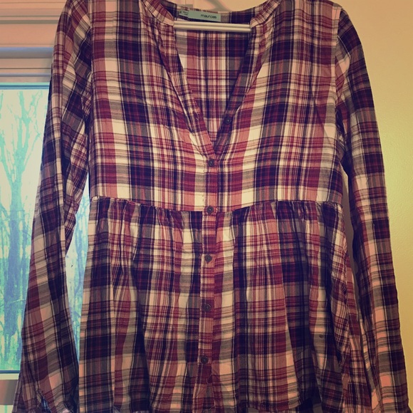 Dressy top, buttons down front halfway then flares out, burgundy and white. Like new condition.