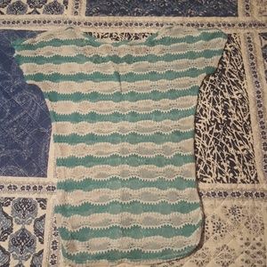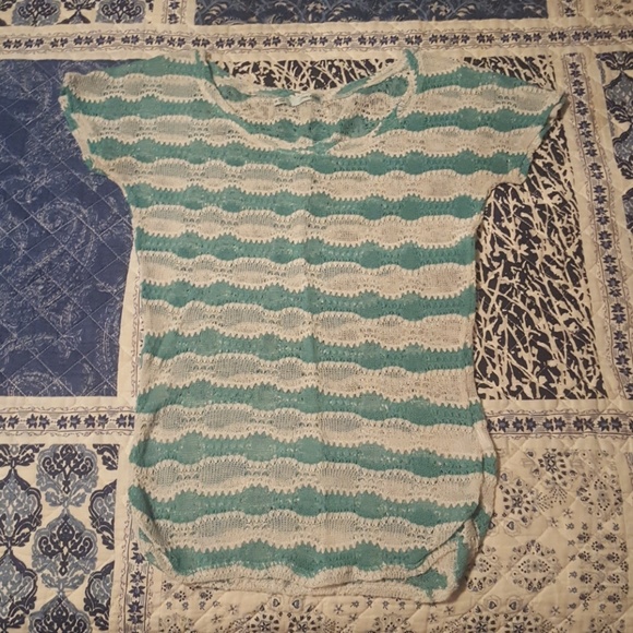 See through mint and white stripped top is in good condition. It's gathered at the bottom of the shirt.
