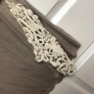 Tan long sleeve boutique shirt with lace on bottom of sleeves size M
