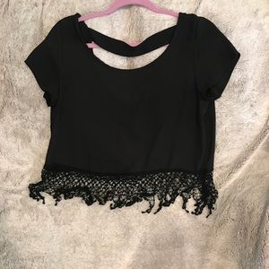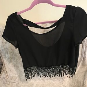 Beautiful silky like black top that is fairly see through and has a crop fit to it. Fringe is a netting detail that's in a braiding detail. Brand New not worn. From Tilly's. Fits smaller than a large but not by much.