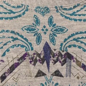 Grey T shirt with Aztec design and fringe detail to both sleeves, super cute with jean shorts and boots!! Fun shirt great for a summer concert! Worn one time. It’s a small but runs big, fits like a medium. Colors are purple and turquoise with a grey background.