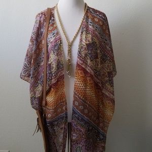 Super light and flowy. Great for layering over a tank top. This is one size and has beautiful multi-colors.