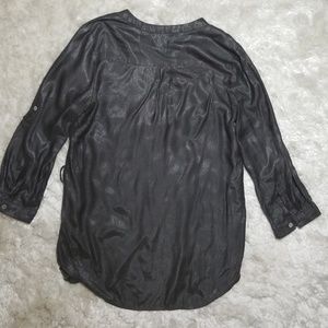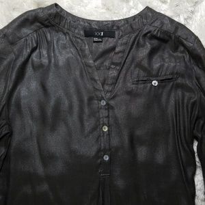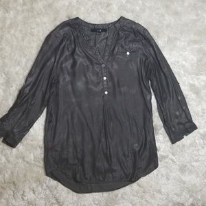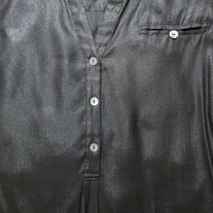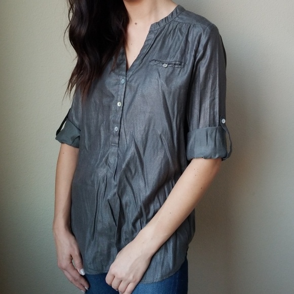 V Neck blouse green gray sparkling color. 3 buttons in front and pocket lift top. Missing belt