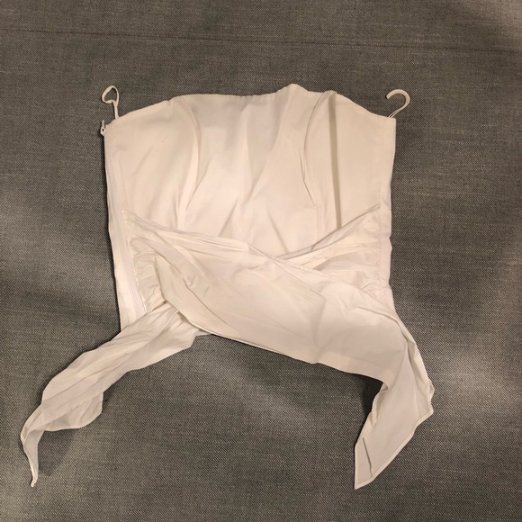 Zip up tube top, has boning, and ties in the front or back