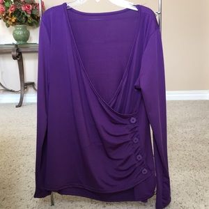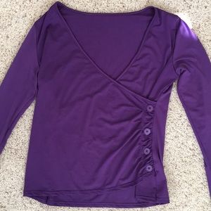 V-neck, long sleeve, beautiful and brilliantly purple. Lightweight comfortable material. Looks very slimming on. Super flattering.