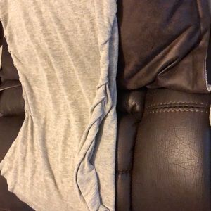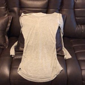 Long sleeve tan shirt w gathers down both sides and it buttons about a forth the way down. It does fit way below waste line but is very flattering on