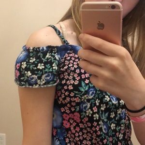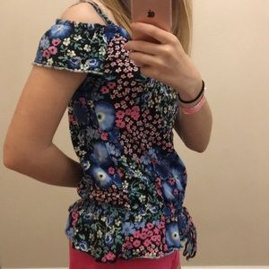 Multi color shirt with of the shoulder sleeves and adjustable straps