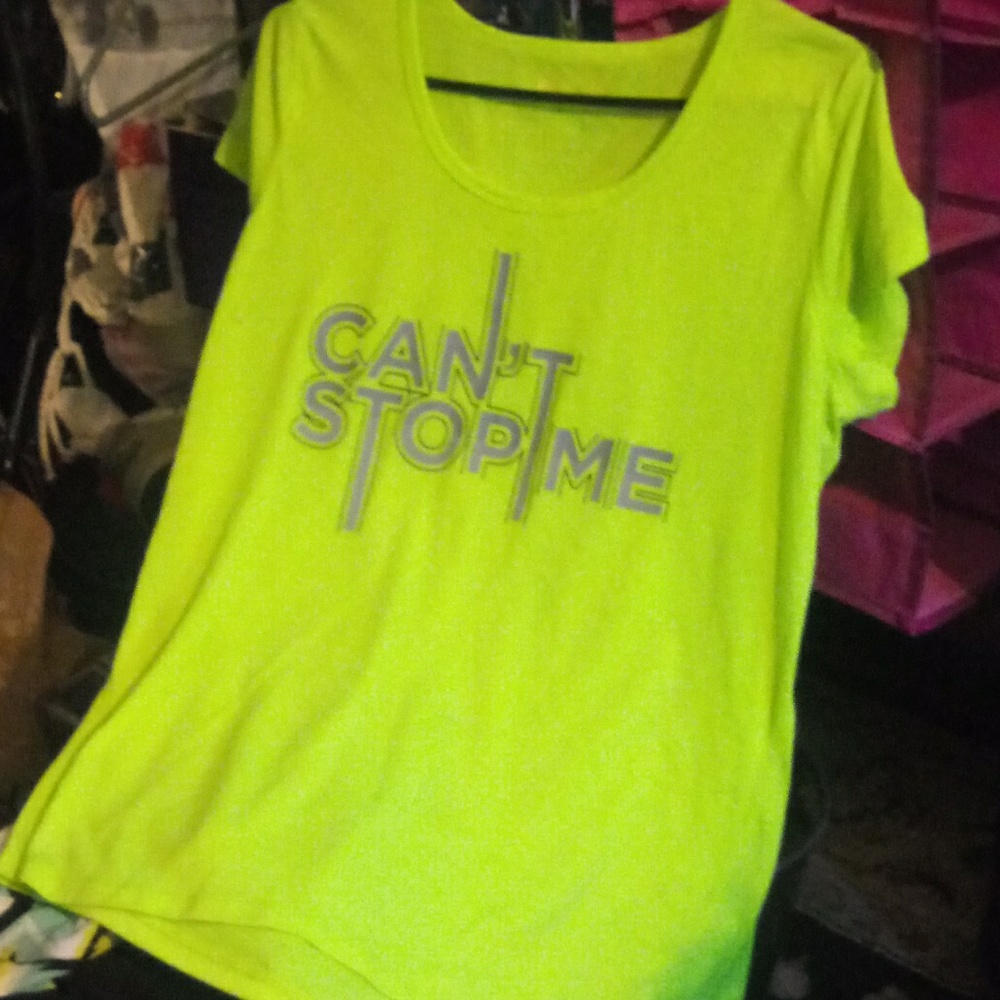 Neon yellow was a silver shiny words that say can't stop me
