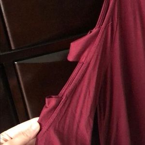 Burgundy long sleeve shirt. Lightweight. Has open shoulders. More of a burgundy color rather than red. Never been worn.