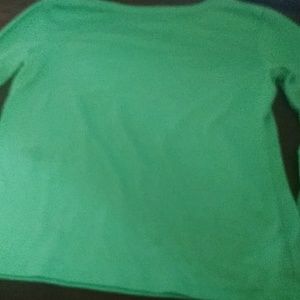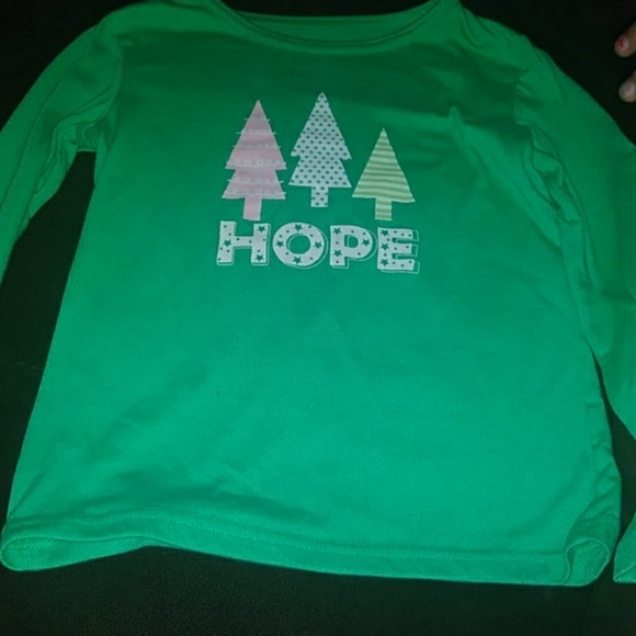 It's a green shirt with three trees on it and the word Hope on it the first tree is pink and white the second tree is a polka dotted blue tree and the third tree is a straight Green Tree and it's a long