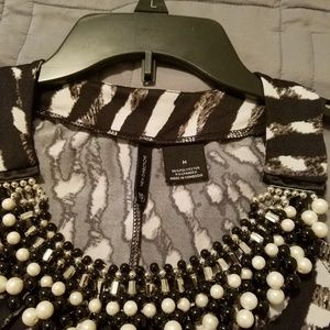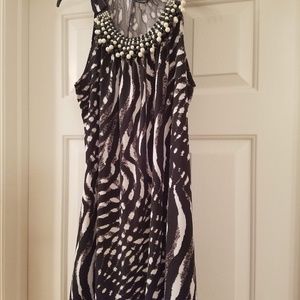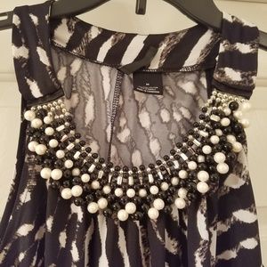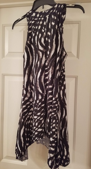 This black & White sleeveless shirt is the length of a tunic. Hi/low sides. Design front beading sets it apart. Smoke/pet free home. EUC. Polyester flowing material. Armpit to armpit =18"; AP to side hem =26", waistline =19"; neck to longest part of hem=27"; bottom width =34"