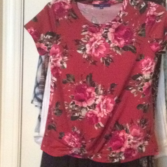 Short sleeve floral knit top. Shades of cranberry, pink, and green. Roux he’d on the right side bottom hem for a little style.. never worn!