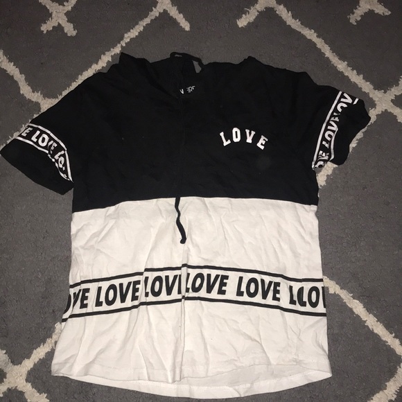 Black and white shirt with a hoodie. That says love across the front and on the sleeves