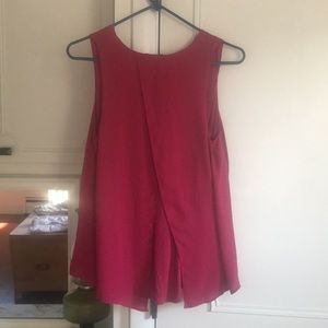 Pink V neck. High/low with a criss cross back. Rayon/Polyester Gentle Wash