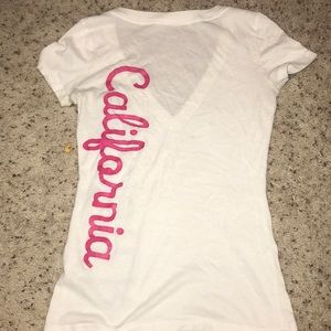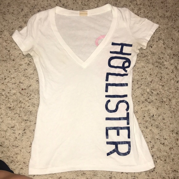 Cotton material, “hollister” in blue on front, “california” in pink on back, slight pit stains (as seen in first picture) but not noticeable when being worn