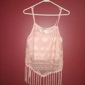 Very cute pale pink color spaghetti strap shirt with tassels along the bottom of the shirt