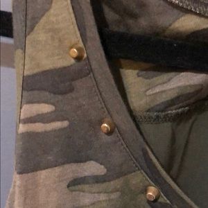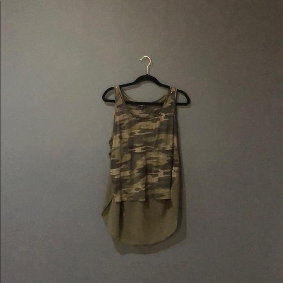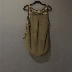 short sleeve and sheer in the back. Camouflage in the front. High low