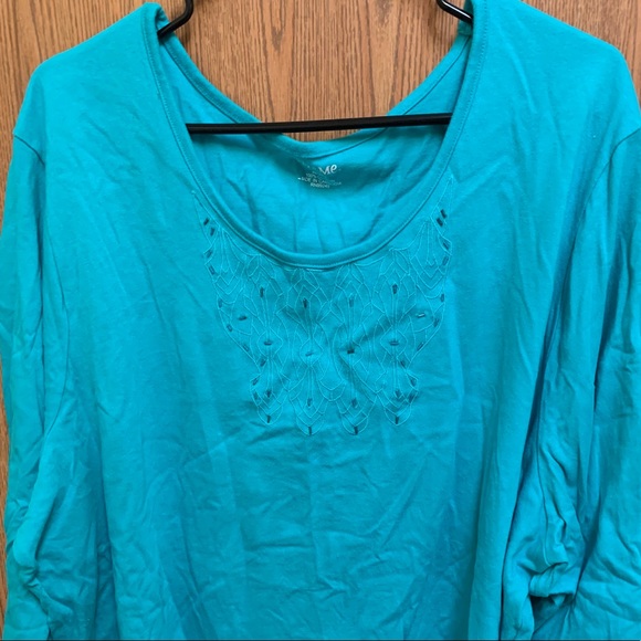 Shirt, 3/4 length sleeves. Has some beads on the front, all are intact. Size 3x 26/28 100% Cotton More teal than green