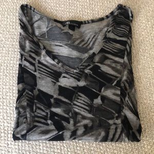 Women’s shirt that can worn casually with jeans or dresses up. Short sleeves with gray and black pattern.