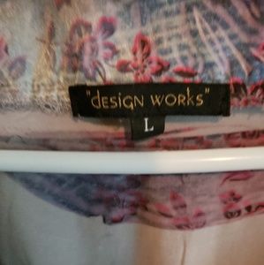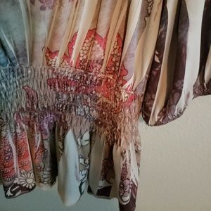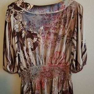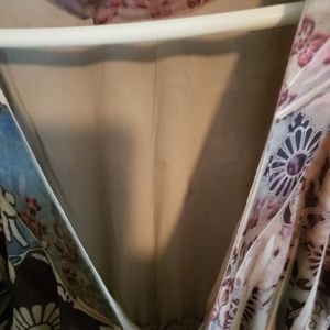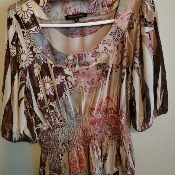 Colorful floral/paisley type of pattern. Shirt feels almost like a thick silk.