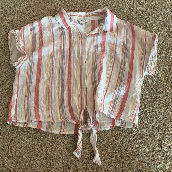 Super cute and stylish shirt. Buttons up and has a tie at the bottom. And is a bit of a crop top depending on what pants you where with it. Never worn before so really good condition. I am lowering this from $20 to $12.50! !