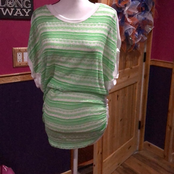 Lime green stripe with gathered sides and short sleeves. Back is solid white