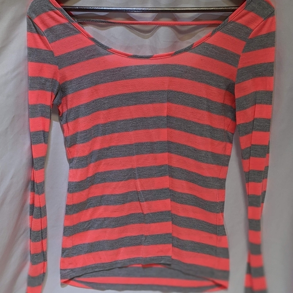 Long sleeve shirt that hugs your figure and flattering swoopback. Color is a neon pink/orange with light gray. Great for a fall day!