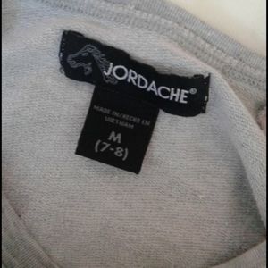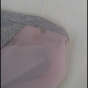Gray 3/4 sleeve shirt with pink see through sleeves. There is a tiny rip in the seam on one of the shoulders.