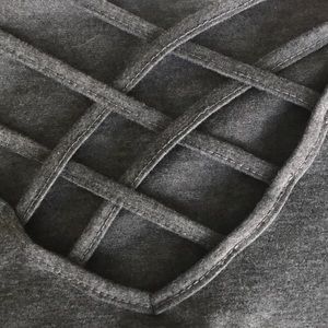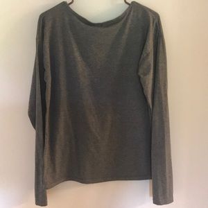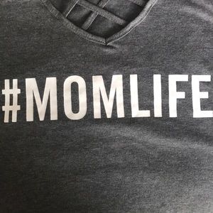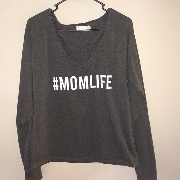 Gray long sleeve t-shirt with sexy criss cross peak-a-boo cleavage detail and #momlife lettering. Who says moms can’t be sexy while moming?!