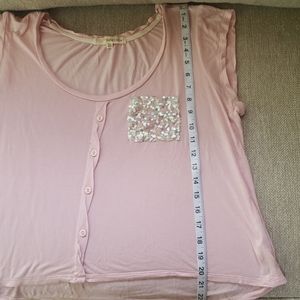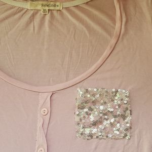 Jjniors - Light pink shirt with sequins on pocket, faux buttons, measurements listed... please not tiny hole 4th pic, compare to button for size.