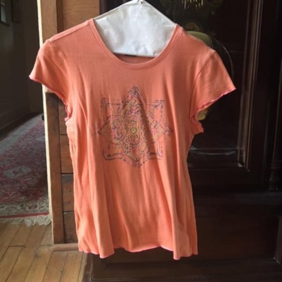 Fitted T-shirt with super cute design. 100% cotton! Pit to pit: 16". Waist: 14 1/2". Length: 23". Size: L. Youth sizing. One small hole in back and one small hole in front- both near bottom of shirt and barely noticeable.