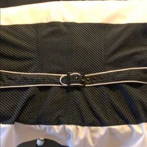 Dress Barn woman one piece blouse white with black pin striped body and belt in back.
