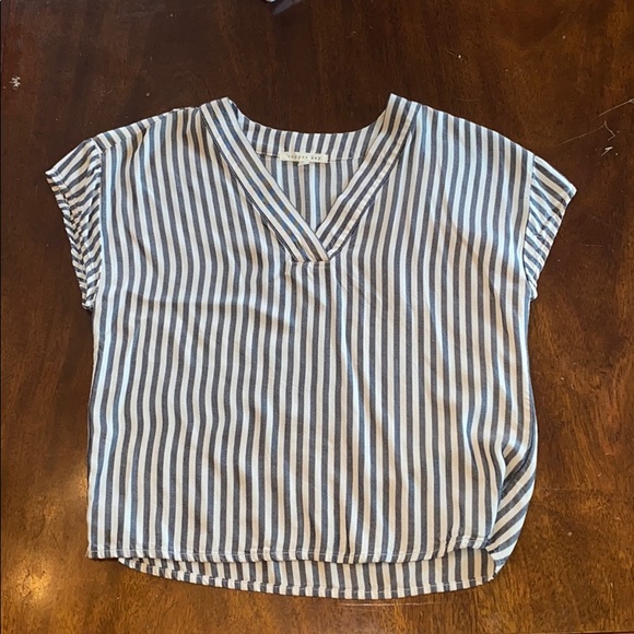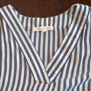 This shirt is from copper key. I wore it once and it is in great condition!! It is a size extra small. It has blue and white strips and short sleeves. It also has a v-neck in the front.