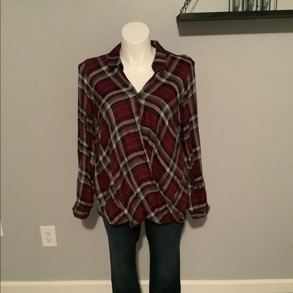 Long sleeve button cuff with attached tab to roll up sleeves. Snap front with cross over blouson hem. Never worn.