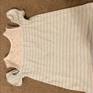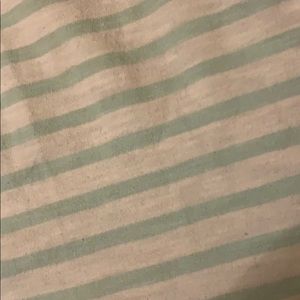 A kid’s striped shirt. The colors are teal and white. Is made out of cotton. The size is 6/7.