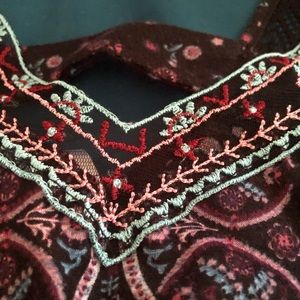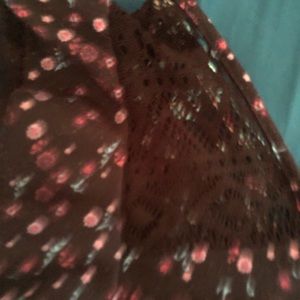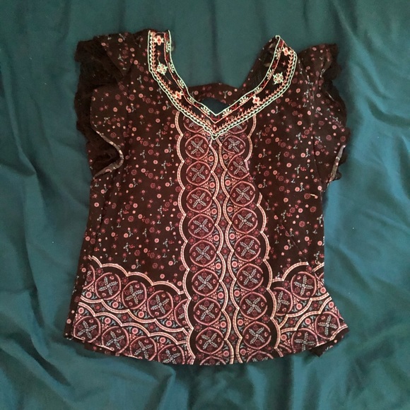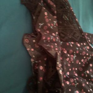 Floral patterned black, pink, and blue shirt. Sleeves have some lace.