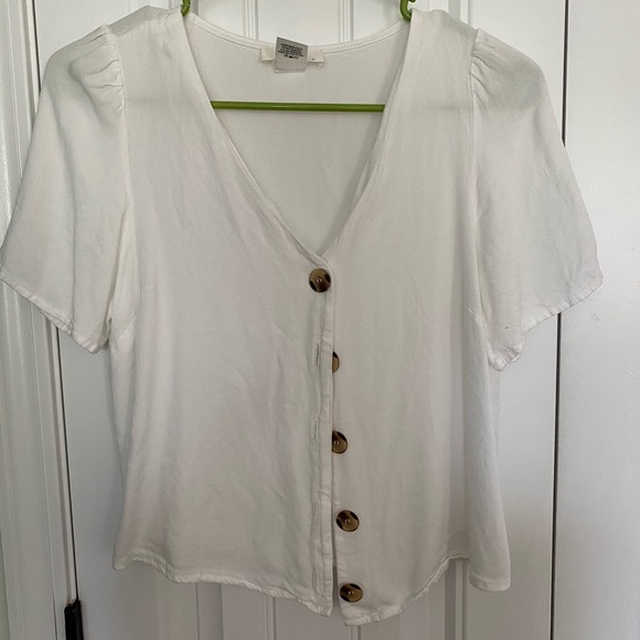 White shirt with brown buttons. 100% rayon fabric. Worn a few times, no stains