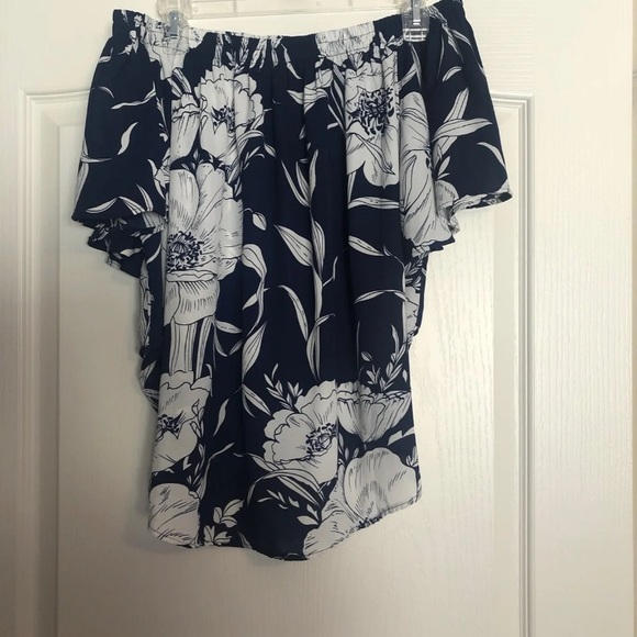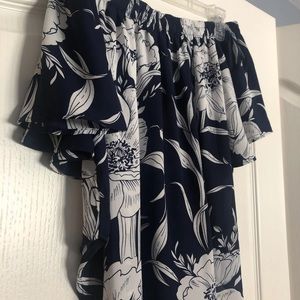 Blousey off the shoulder floral shirt, navy with white flowers, slight ruffle in sleeve