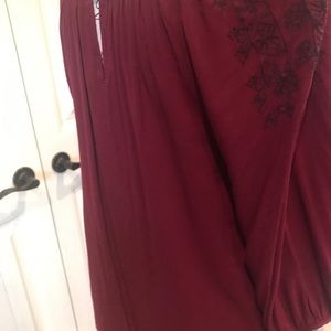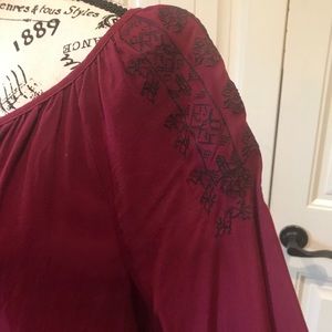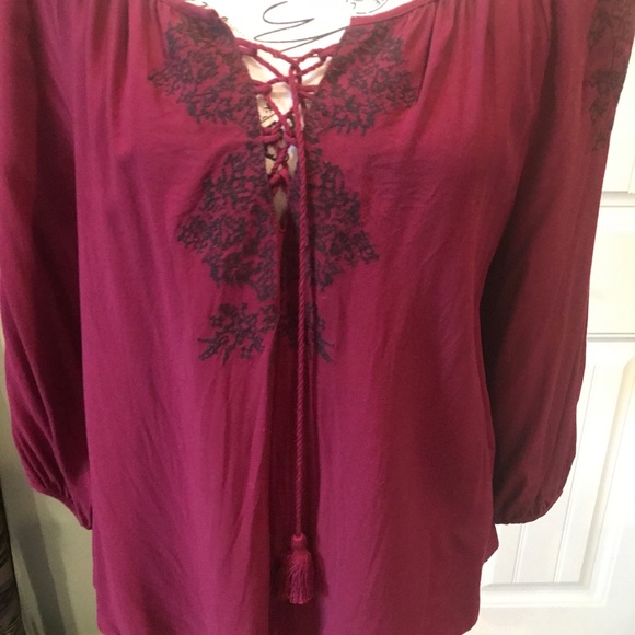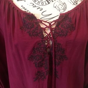 Maroon with black stitching on the shoulders and front of shirt. Comfortable and in great condition. Lace up front.