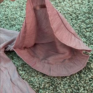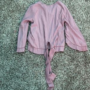Pinkish purple shirt. Has tie in the back, and flared arms